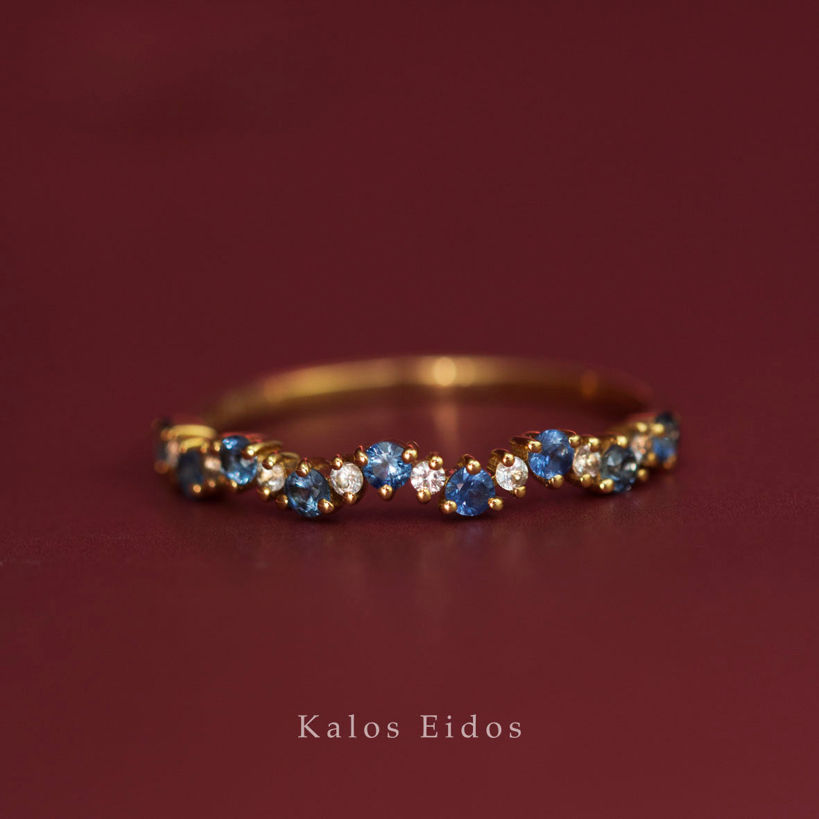 本商品使用的寶石為白色藍寶石和藍寶石。將兩種不同顏色的寶石結合,創造出獨特視覺和層次感。